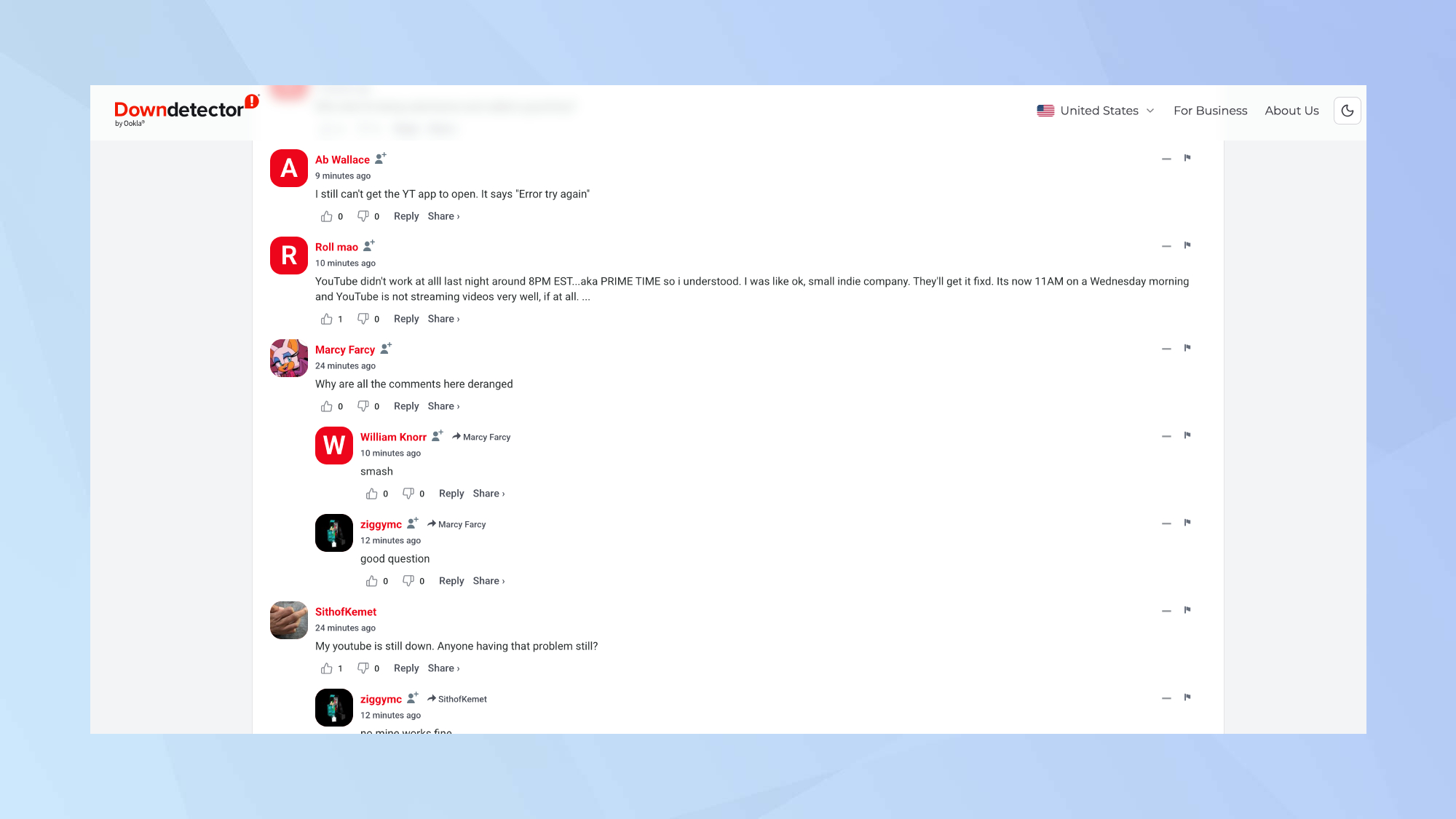 Since we last checked in, the number of reported cases of issues with YouTube in the U.S. dropped from just over 30K to closer to 22K.