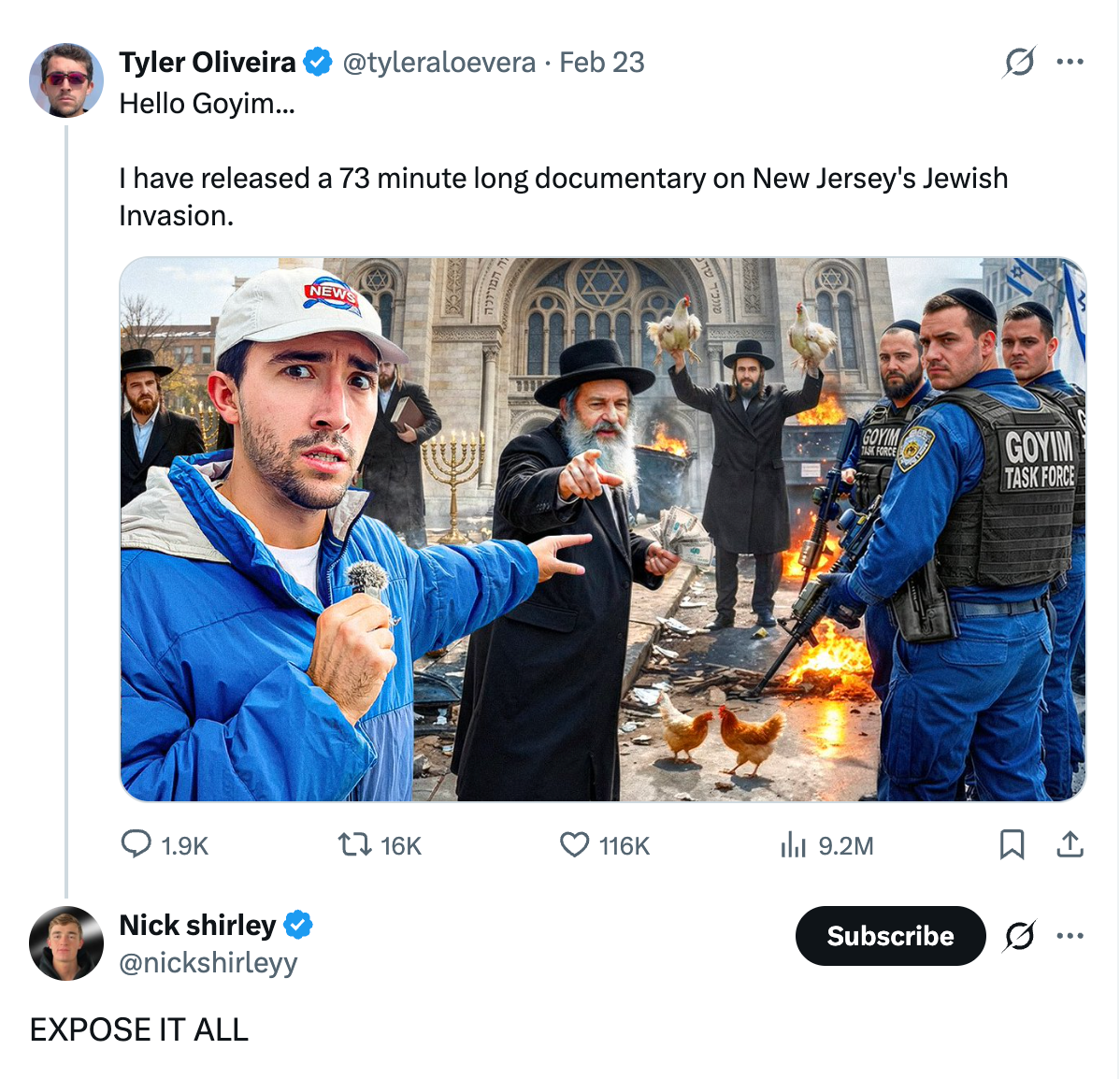 The 23-year-old responded to a post by fellow Youtuber Tyler Oliveira promoting a “documentary on New Jersey's Jewish Invasion.”