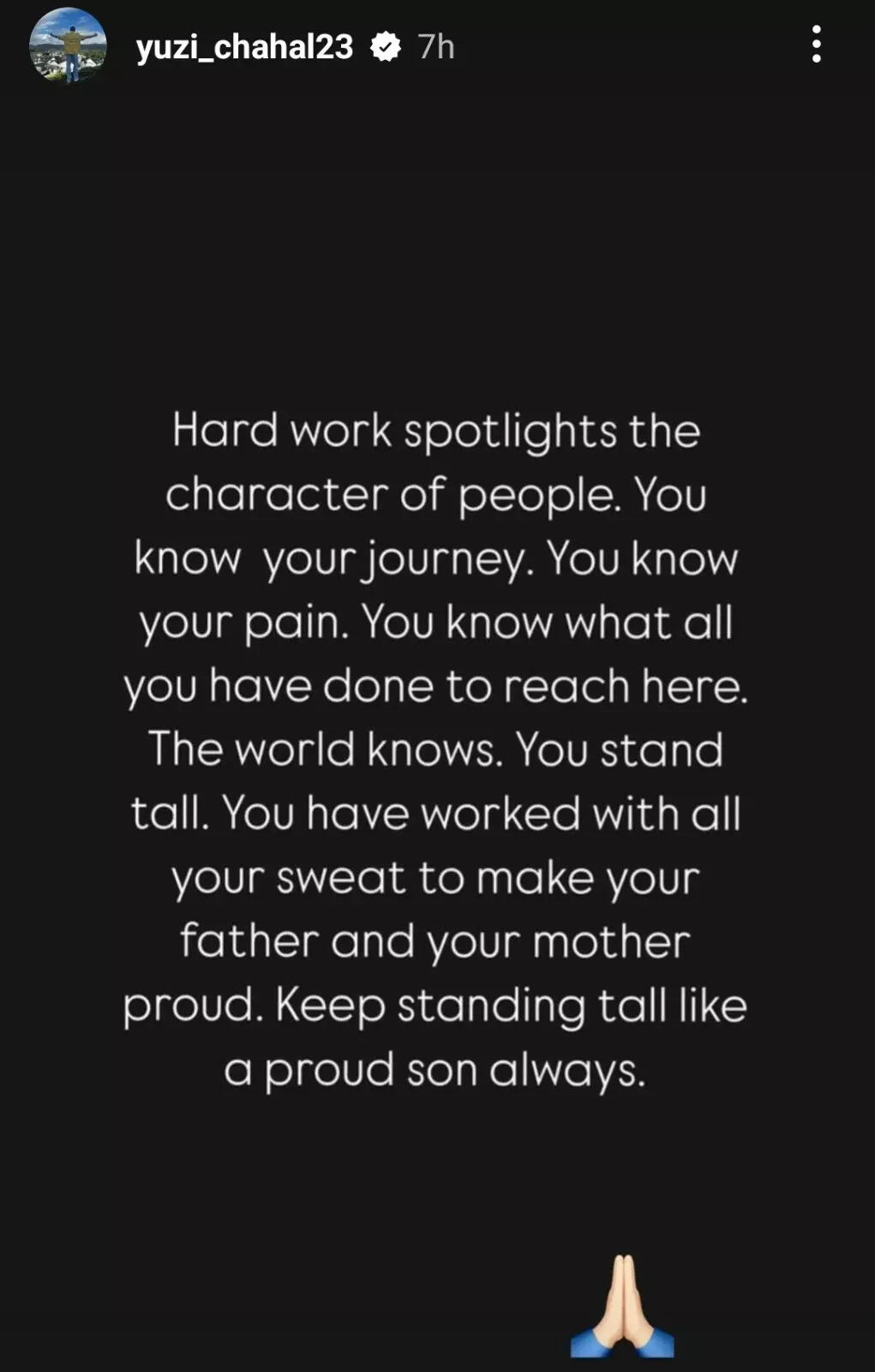“Hard work spotlights the character of people. You know your journey. You know your pain. You know what all you have done to reach here. The world knows. You stand tall. You have worked with all your sweat to make your father and your mother proud. Keep standing tall like a proud son always,” he wrote in the Instagram story.